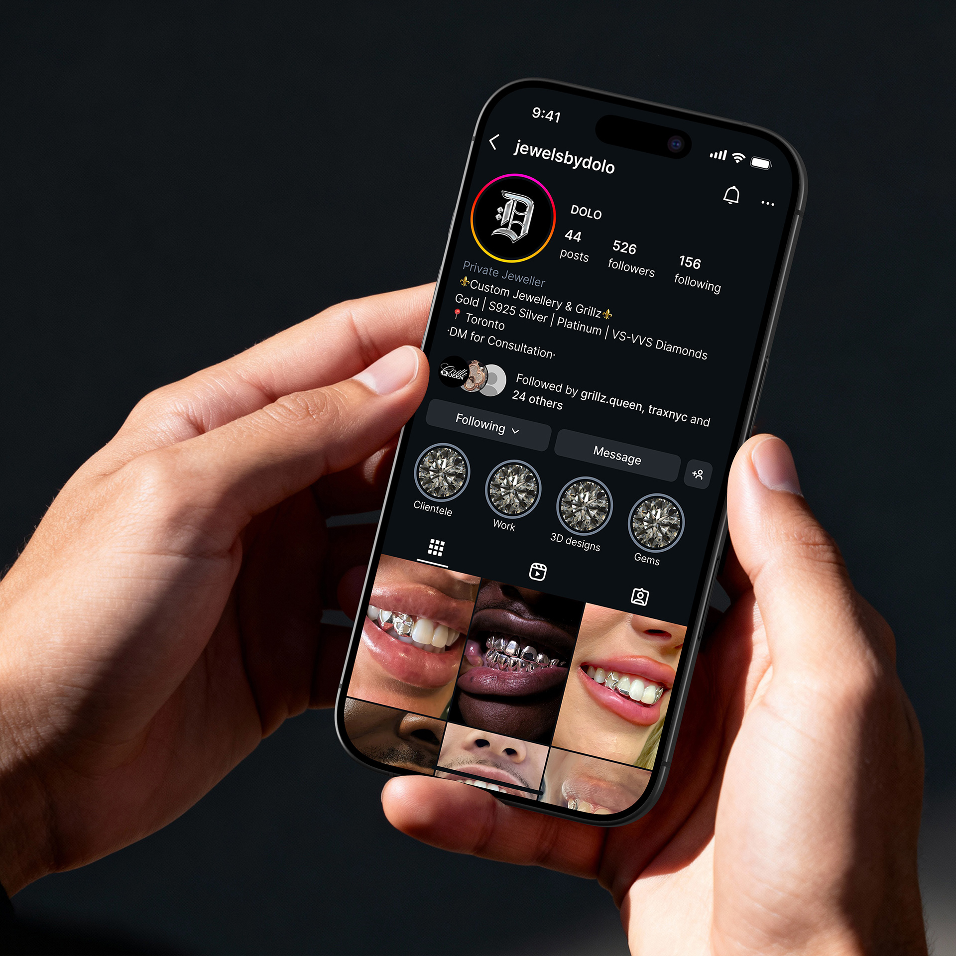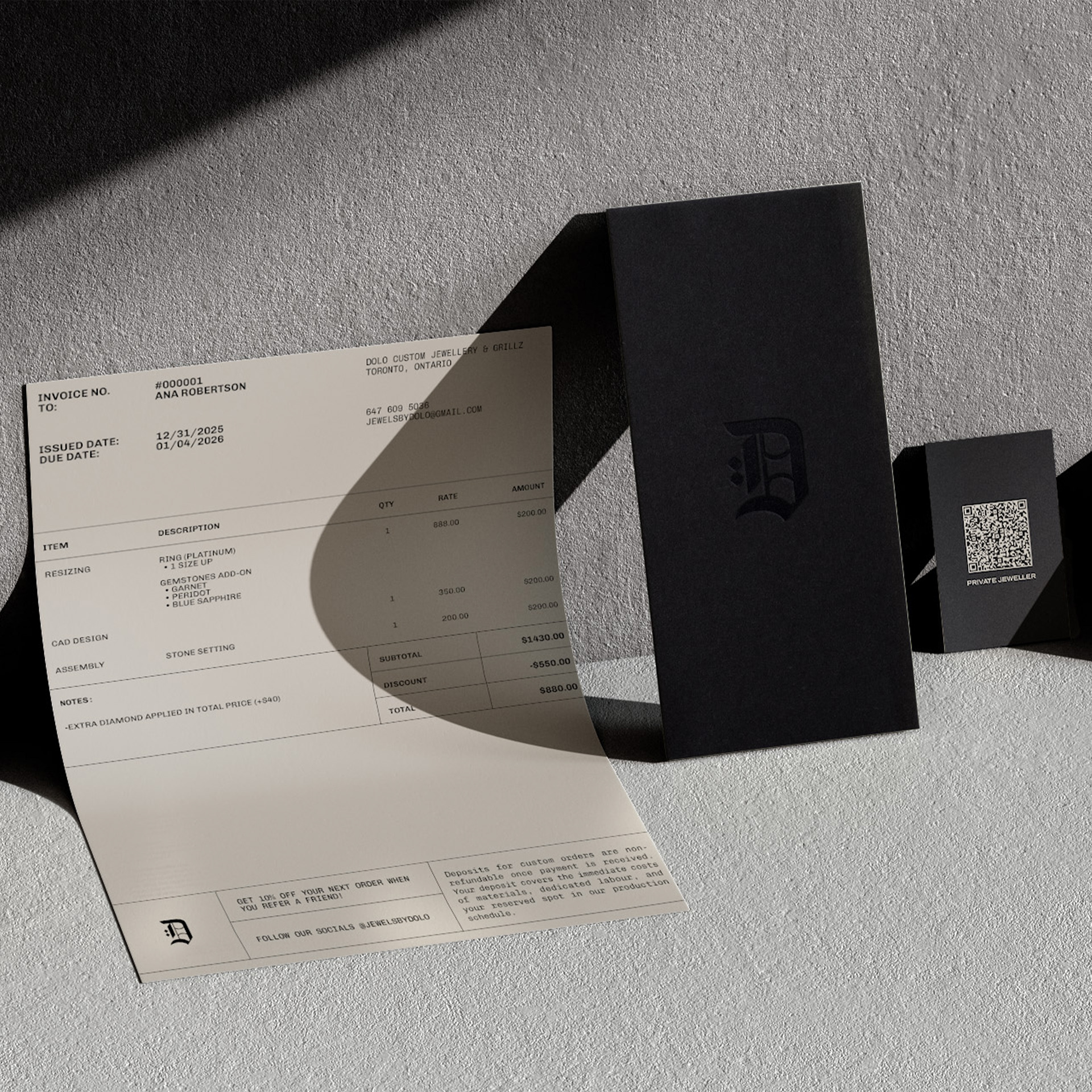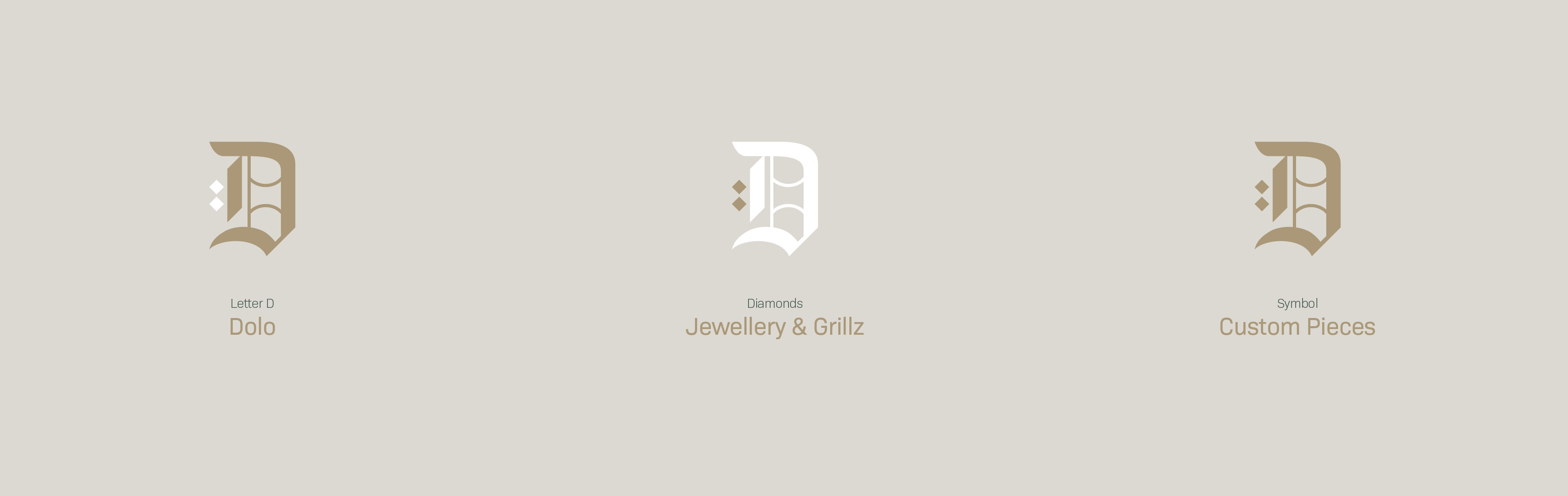 Dominic, the owner, approached me to build a brand identity that could support his plans and establish a strong presence in the custom jewellery market. I developed a logo inspired by his nickname "Dolo"—a bold Gothic "D" accented with two diamonds—creating a symbol that balances quality with craftsmanship.